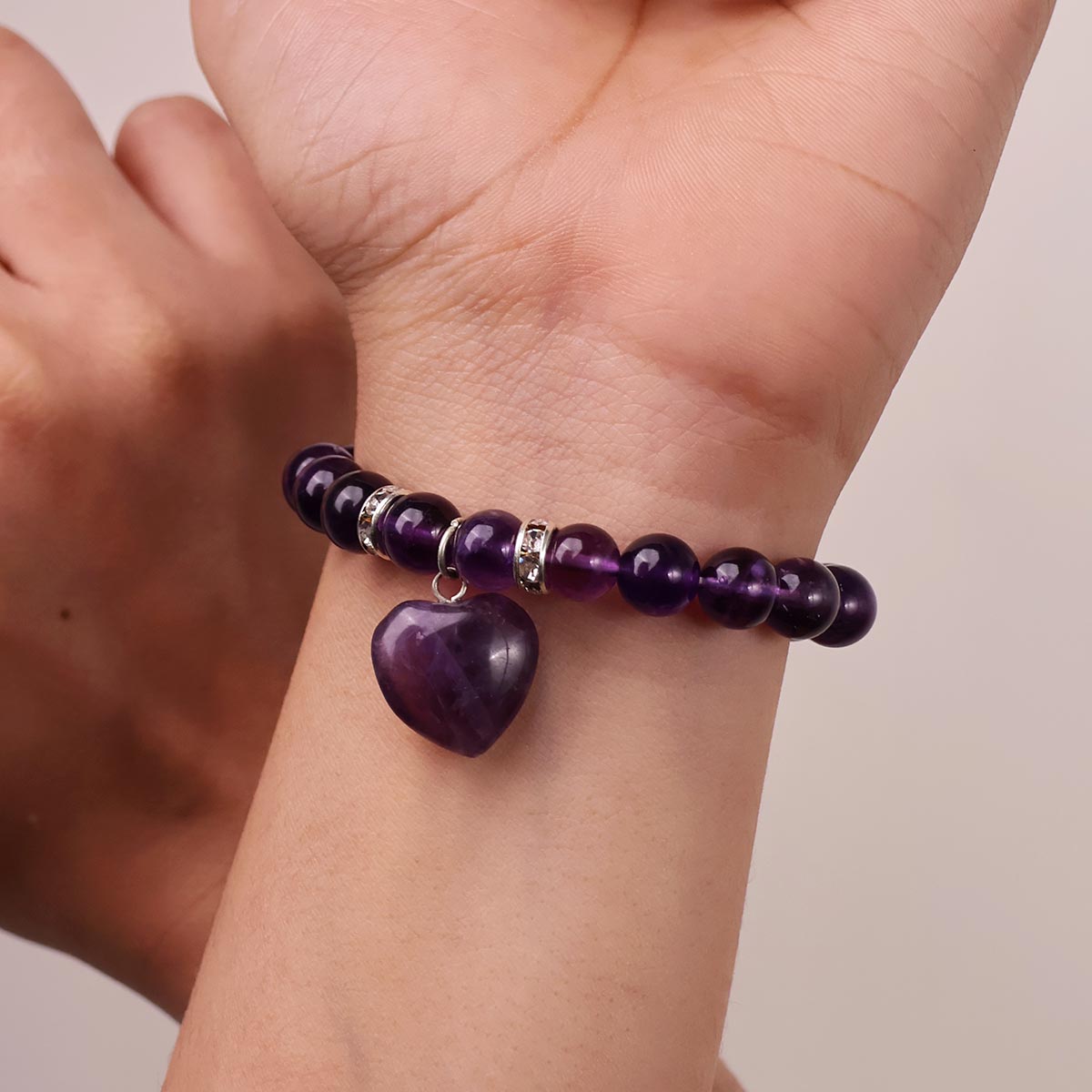 The benefits of wearing a Amethyst Bracelet are countless, yet some assured benefits experienced by people are shared : Protecction, Purification, Spirituality, Increases nobility, Spiritual awareness, Psychic abilities, Inner peace and healing, Healing of body, mind & soul, Positive transformation, Meditation, Balance, Relieves stress, Communication.Amethyst is a stunning semi precious stone with exceptional healing powers can help you. When it comes to texture, it is violet-purple in colour with excellent luster and transparency. Amethyst is a protective stone and is a symbol of strong relationships and courage.Products Size : Stratchable,Diameter :- 6 Cm, Beads :- 8mm,Weight : 24 gm, (23 Beads), (COLOR-Purple).; 1 Amethyst with Heart Charm Bracelet for Women and Girls.Please Note: You will receive one crystal similar to the ones photographed. Photos show typical quality. Each and every crystal is unique.