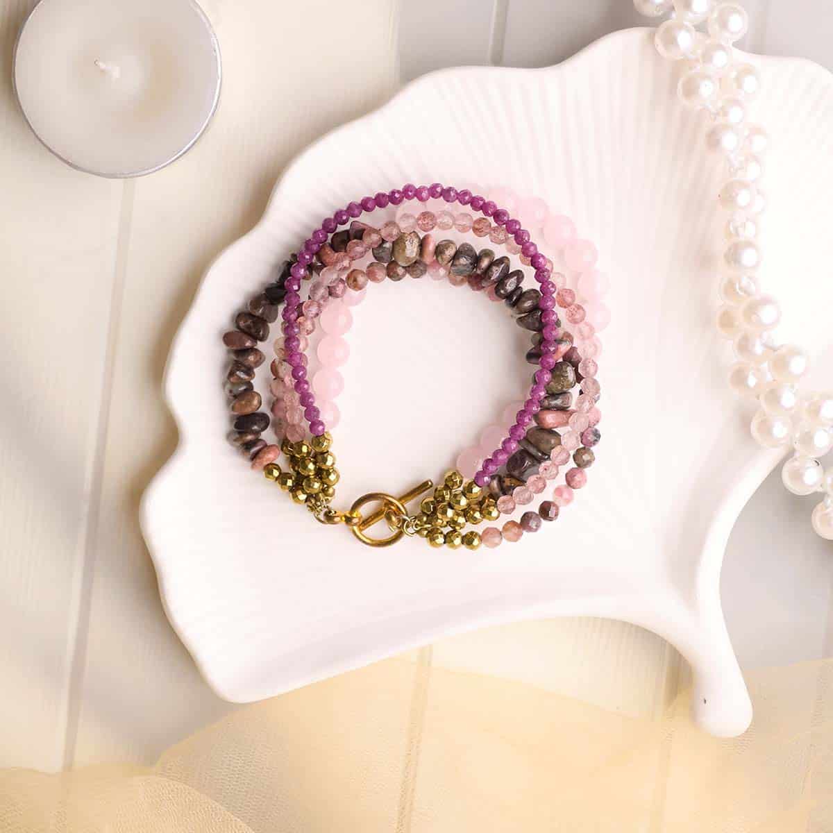 The Pink Five Layered Bracelet is a graceful blend of crystals that radiate love, compassion, and emotional harmony. Designed with Rose Quartz, Ruby, Rhodonite, Strawberry Quartz, and Golden Hematite, this bracelet is perfect for opening the heart, deepening relationships, and nurturing self-love.Its soft pink tones with golden shimmer make it a beautiful symbol of affection and emotional strength.
