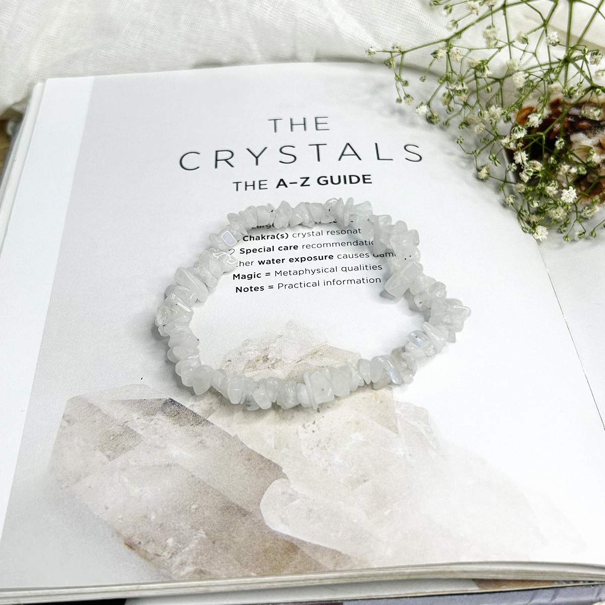 Rainbow Moonstone glows like a soft celestial light captured in crystal form, guiding you through emotional tides with grace. This bracelet supports intuition, feminine energy, and emotional balance, making life’s ups and downs feel a little more magical and manageable.Each uniquely shaped chip shimmers with iridescent flashes, adding a touch of mystique and style to your everyday look. A perfect companion for new beginnings, creativity, and inner peace.